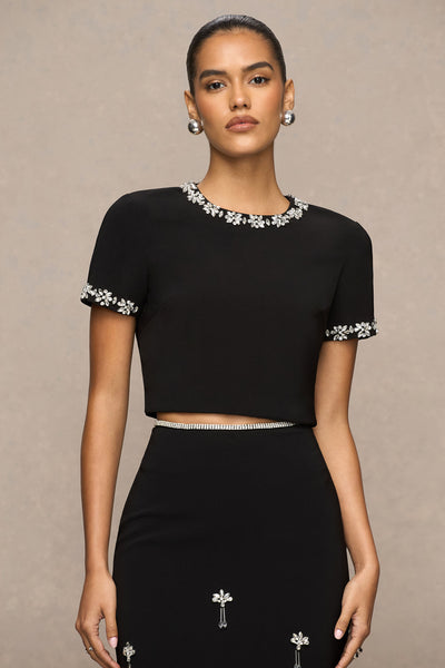 Step out in effortless elegance with the Aven. Crafted in our premium black crepe, this maxi skirt features a flattering silhouette that drapes beautifully. The embellished waistline adds a touch of glamour, while delicate embellishments throughout elevate the look seamlessly. Designed with a centre-back split, it allows for movement and a subtle hint of allure. Pair with our Salma top for a look that exudes chic sophistication.